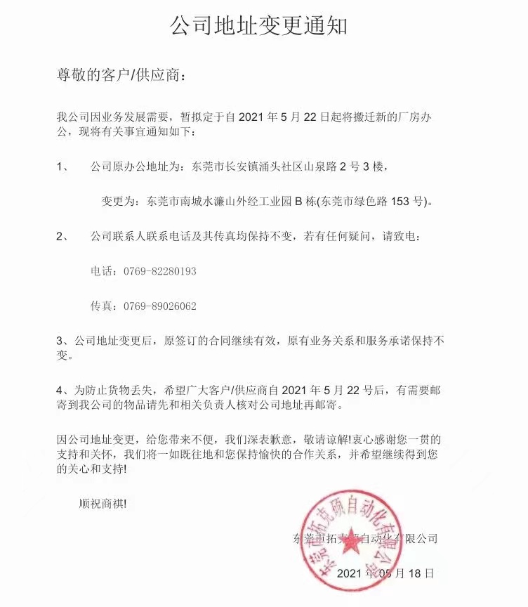 拓克碩自動(dòng)化——地址變更通知