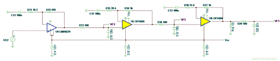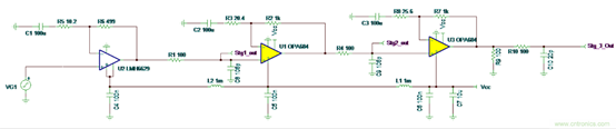 圖 2 所示的范例采用了 LMH6629 作為第一級,OPA684 作為第二級和第三級。